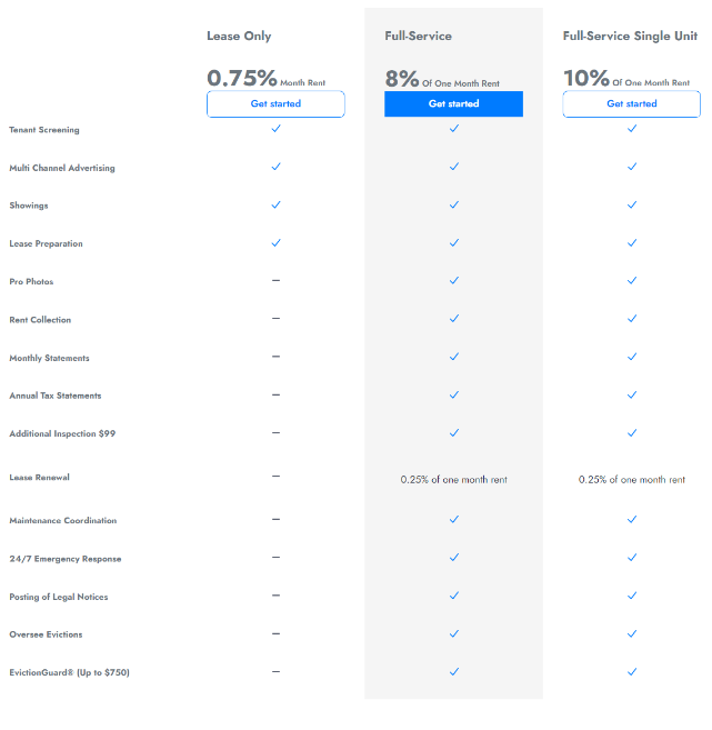 | Price | starting at One Month Rent Get started | starting at 8% Of One Month Rent Get started *varies based on monthly rent | starting at 10% Of One Month Rent Get started |